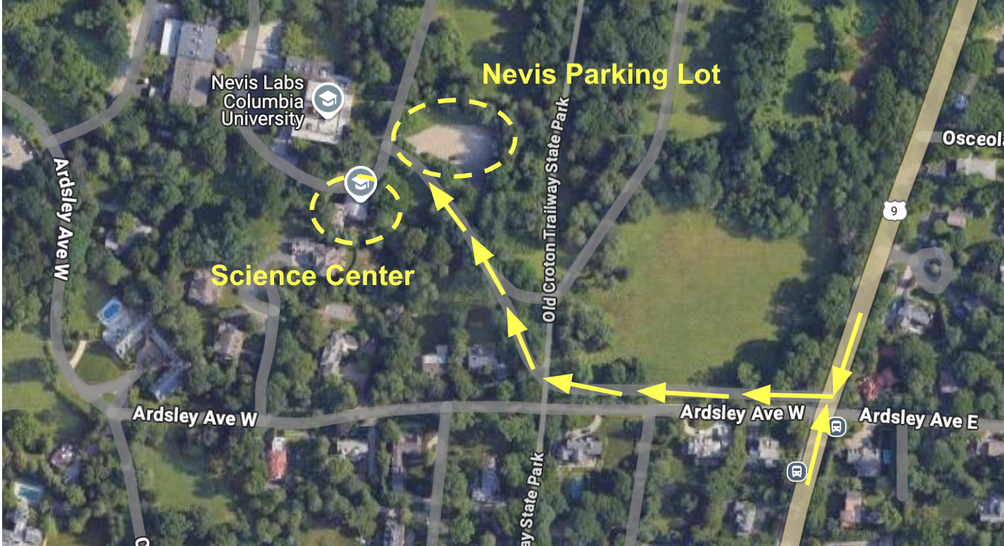 From Ardsley-on-Hudson station (~10 minute walk): Take the left-hand road uphill (Ardsley Avenue West). Take the first asphalt driveway on the left to enter the Nevis estate. Follow the S-curve of the road to the right around the Cyclotron Building, and continue to follow the road as it bends to the left. When you see the main parking lot at the top of the hill, the Research Building will be on your left and the Nevis Science Center will be on your right: